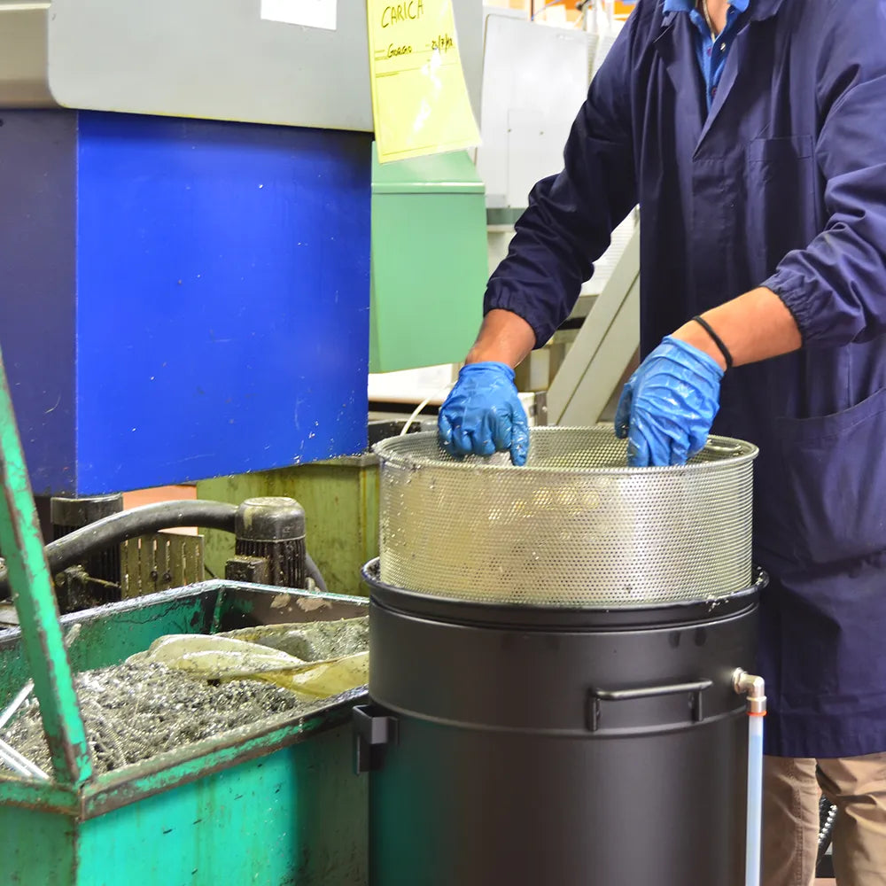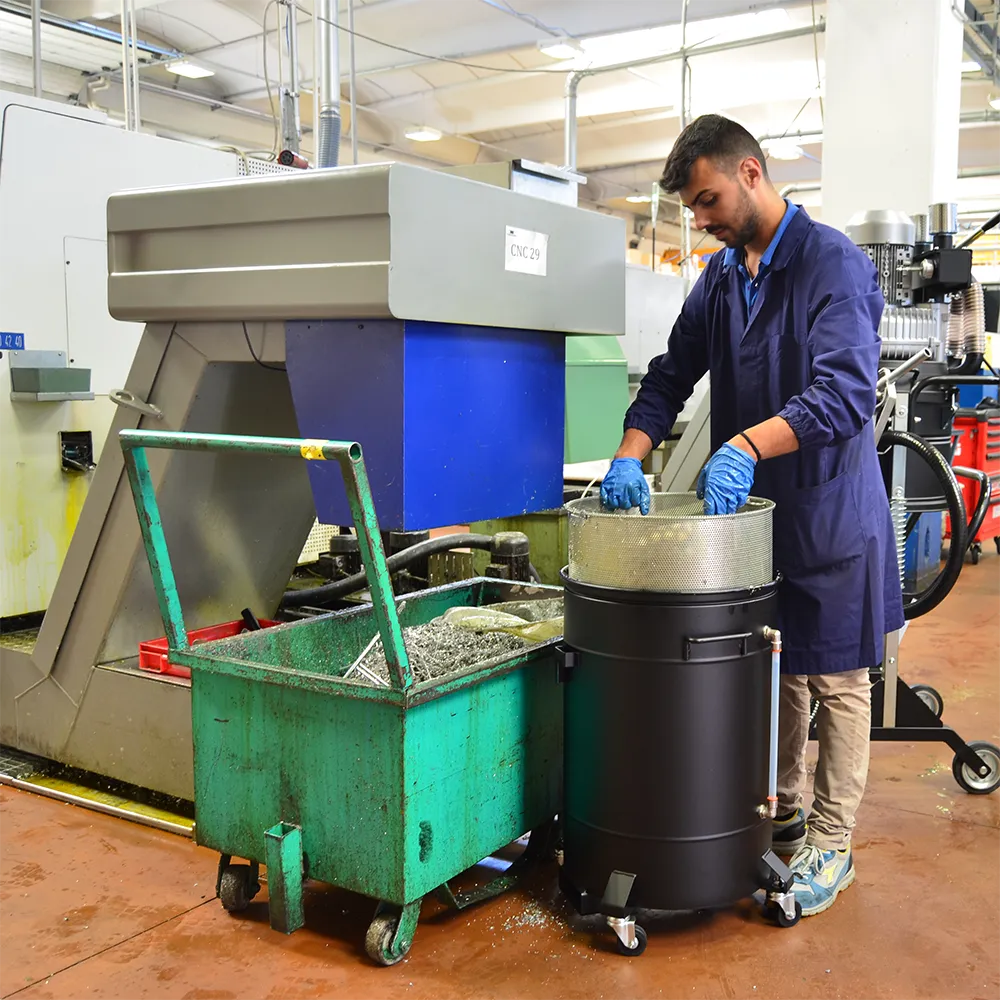 The SV1-425-LBO industrial vacuum is designed to vacuum and separate oil and swarf from the tanks, on the tables, and guides of tooling machines. Suction is generated by a side-channel turbine and ensures excellent vacuum speed and power. The SV1-425-LBO industrial vacuum can work continuously and thanks to its small size facilitates vacuuming even in the narrowest of spaces. The container of this vacuum cleaner is equipped with a metal basket that is used to separate the solid part from the liquid part and a 150-micron nylon filter for more effective filtration. The floating level switch automatically stops professional suction upon reaching maximum capacity in the container (100 l of emulsified oil vacuumed). There is a level indicator on the outside of the container that indicates the amount of liquid inside the machine. Discharge takes place by gravity thanks to a “reverse flow” system, which replenishes all of the lubricant-coolant vacuumed and filtered again in the machine.