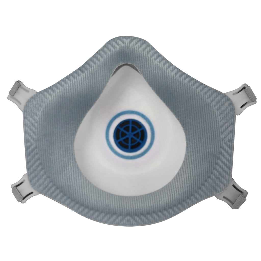 Moulded disposable respirator with comfort foam surround, adjustable nose clip, four-point adjustable harness and exhalation valve.