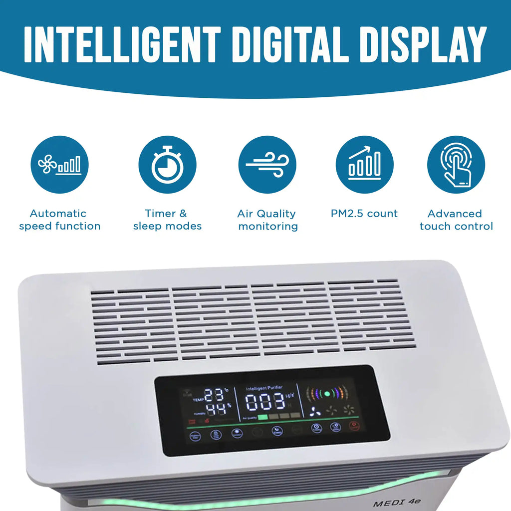 Discover the Medi® 4e, a sleek and intelligent air purification solution perfect for a variety of settings, from the comfort of your home to the efficiency of a small office or a medical environment. This high-performance design is equipped with HEPA & Gold Carbon Filters, UVC technology, and an array of additional features to ensure pristine air.