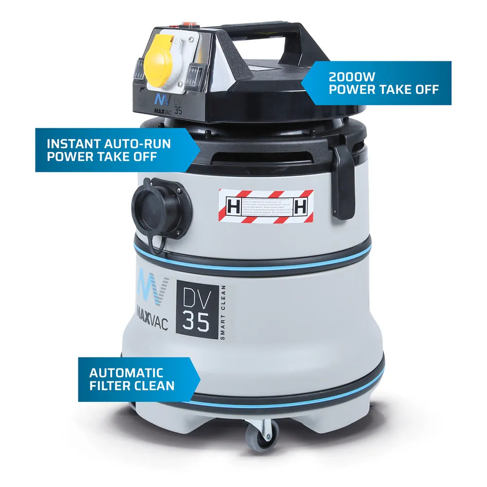 The MAXVAC Dura DV35-HBA Smart Clean is a certified H-Class single motor vacuum. It has power take off with over-run and auto filter clean.