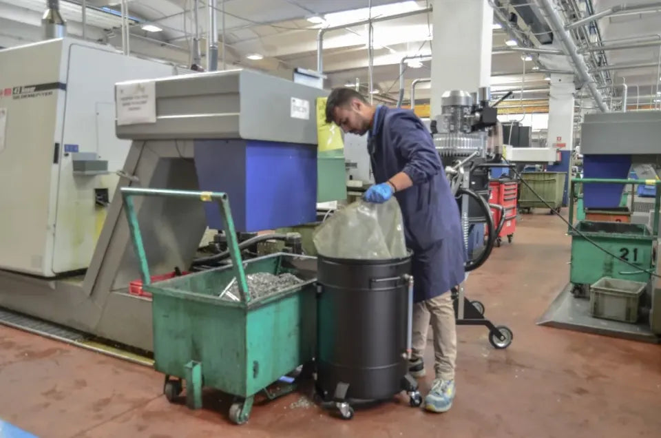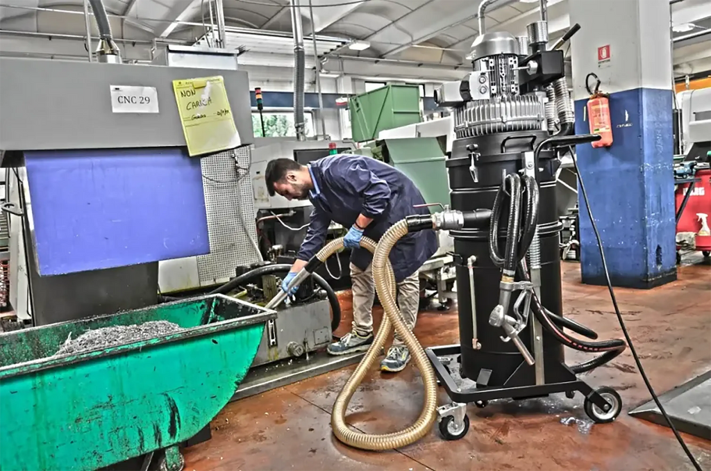 The SV1-425-LBO industrial vacuum is designed to vacuum and separate oil and swarf from the tanks, on the tables, and guides of tooling machines. Suction is generated by a side-channel turbine and ensures excellent vacuum speed and power. The SV1-425-LBO industrial vacuum can work continuously and thanks to its small size facilitates vacuuming even in the narrowest of spaces. The container of this vacuum cleaner is equipped with a metal basket that is used to separate the solid part from the liquid part and a 150-micron nylon filter for more effective filtration. The floating level switch automatically stops professional suction upon reaching maximum capacity in the container (100 l of emulsified oil vacuumed). There is a level indicator on the outside of the container that indicates the amount of liquid inside the machine. Discharge takes place by gravity thanks to a “reverse flow” system, which replenishes all of the lubricant-coolant vacuumed and filtered again in the machine.